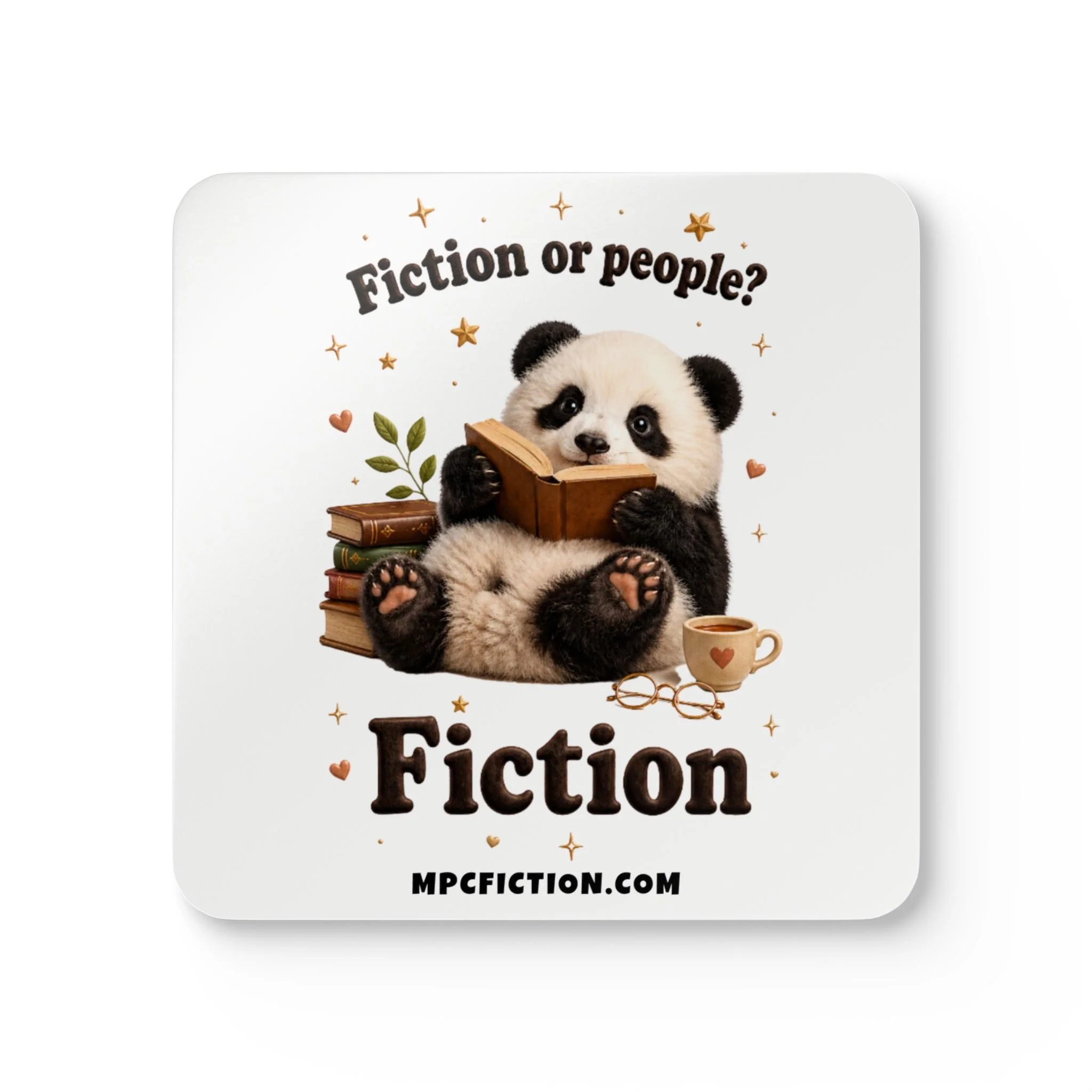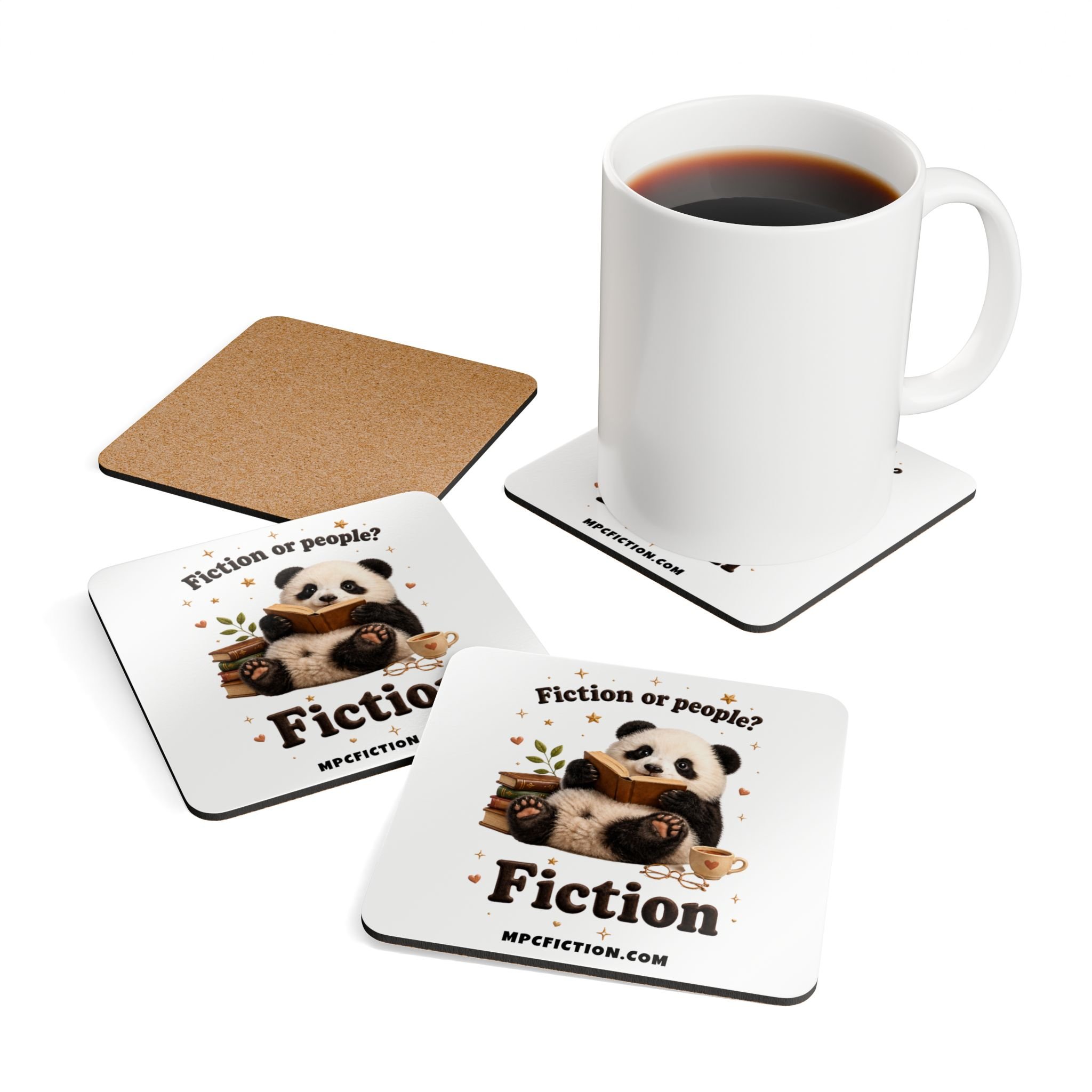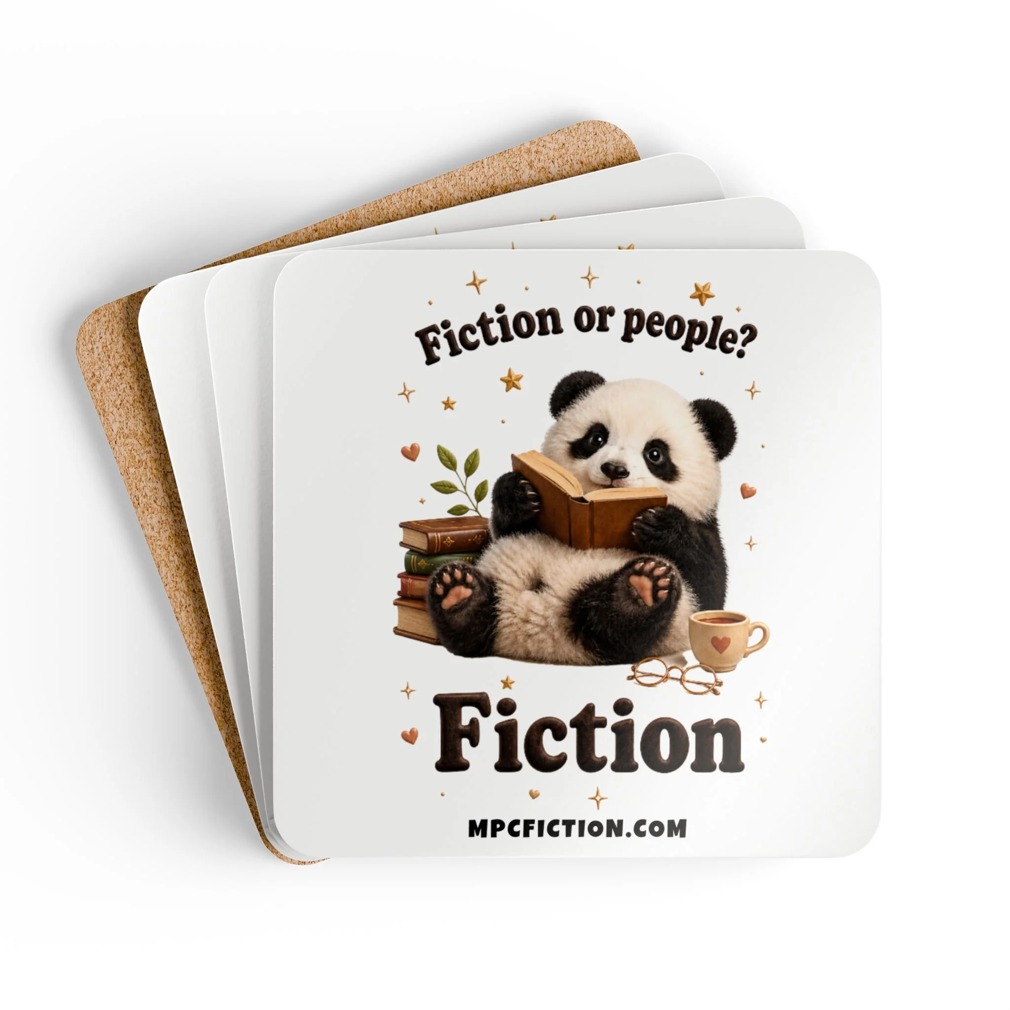 Bring a warm, bookish touch to your table, desk, or reading nook with this MPCfiction exclusive coaster set, created for readers who know exactly why they are here. Featuring an adorable little reader with glasses, a cozy drink, an open book, and a playful literary quote, this set adds a soft literary charm to everyday spaces while showing off your love for romance books.