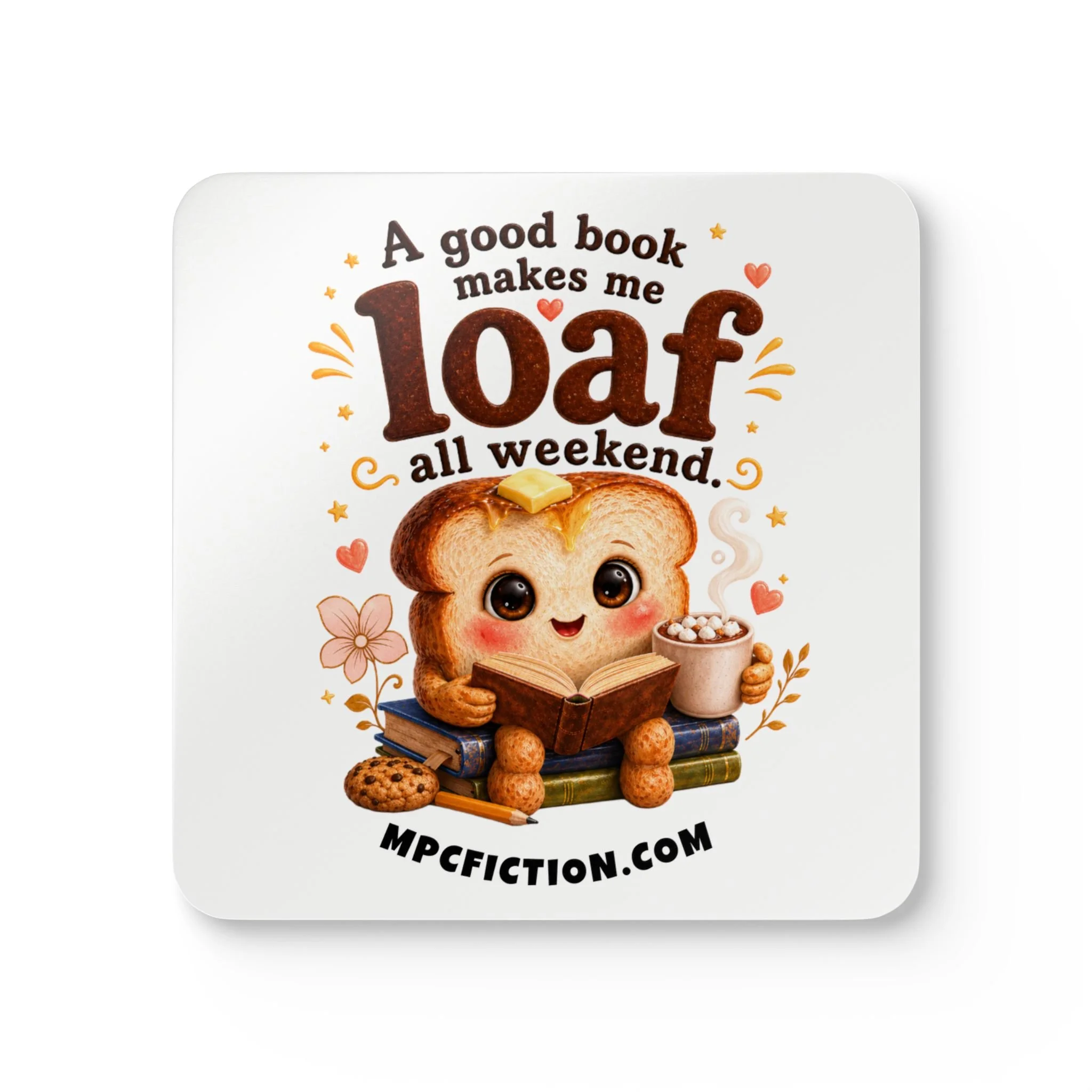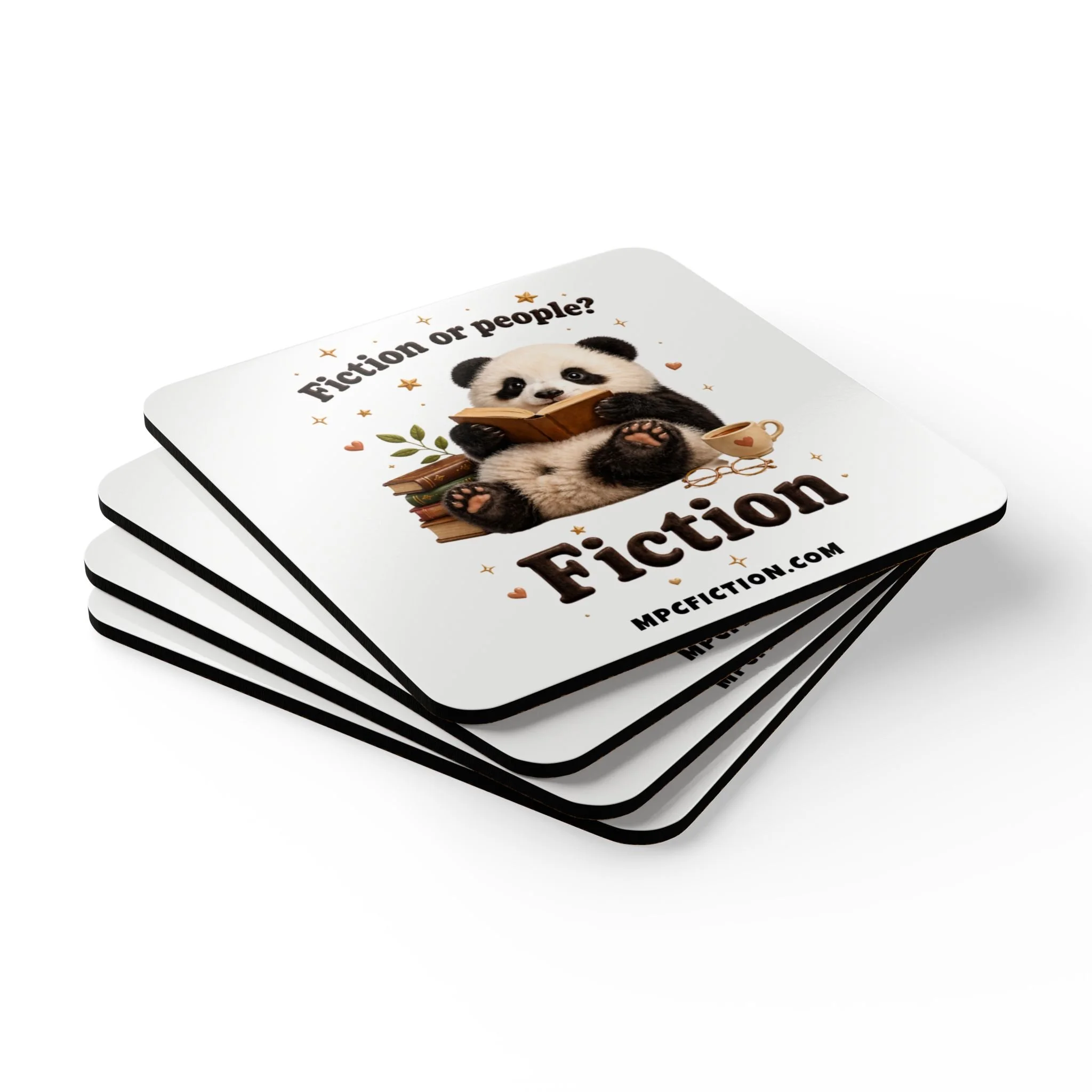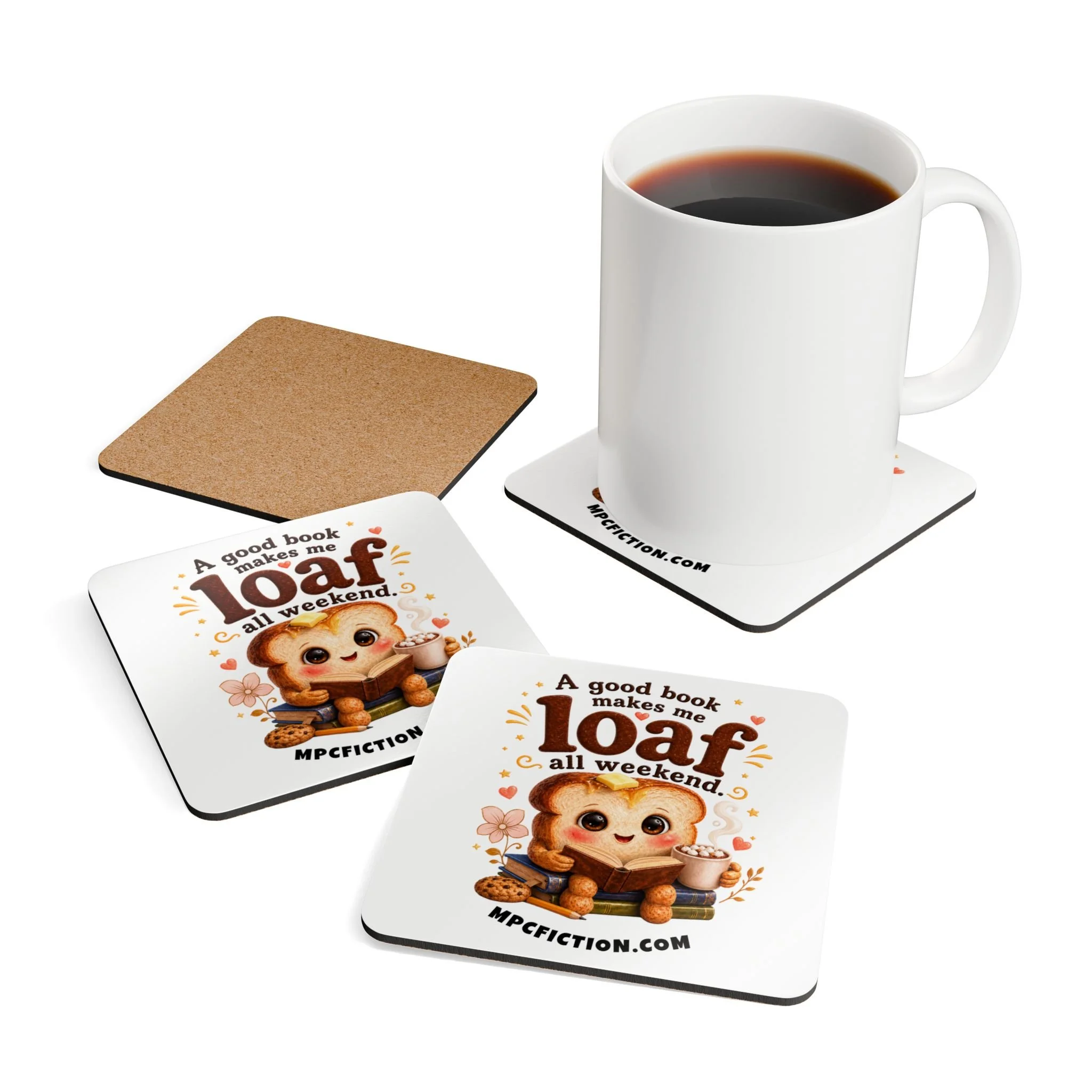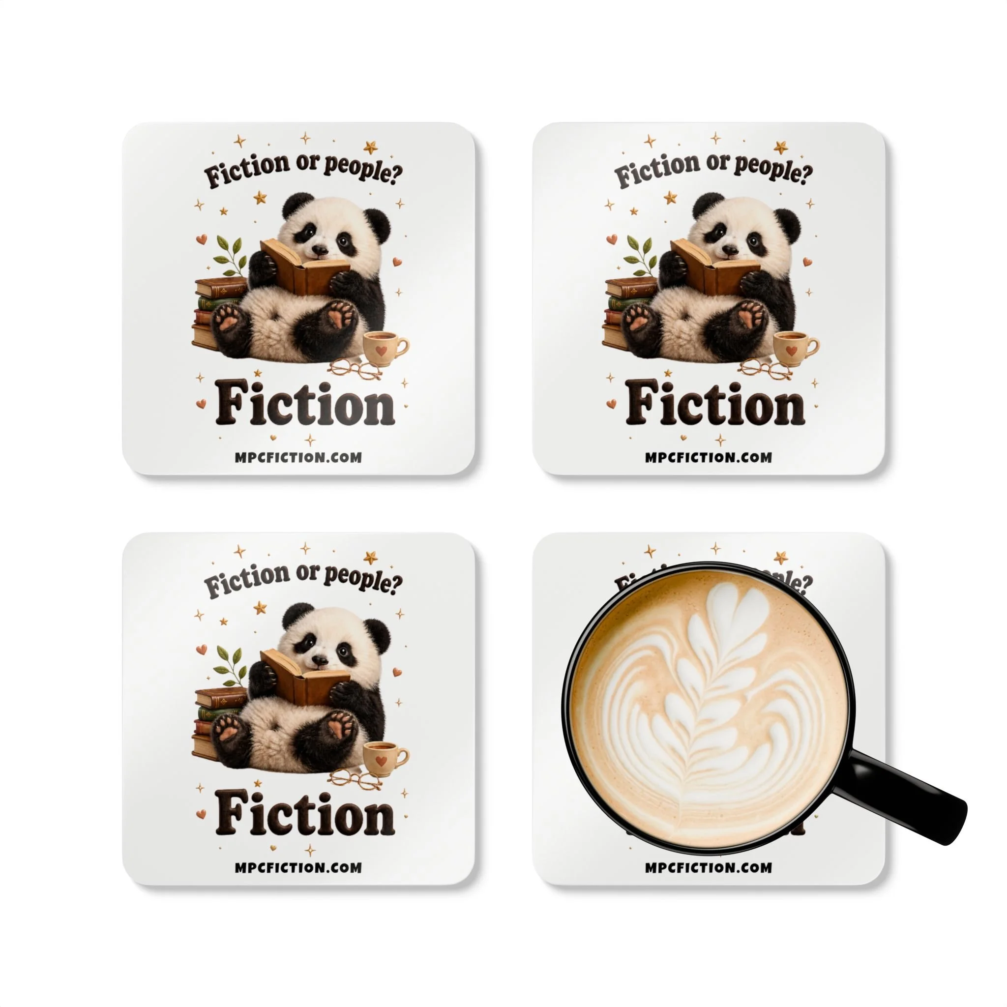Bring a warm, bookish touch to your table, desk, or reading nook with this MPCfiction exclusive coaster set, created for readers who know exactly why they are here. Featuring an adorable little reader with glasses, a cozy drink, an open book, and a playful literary quote, this set adds a soft literary charm to everyday spaces while showing off your love for romance books.